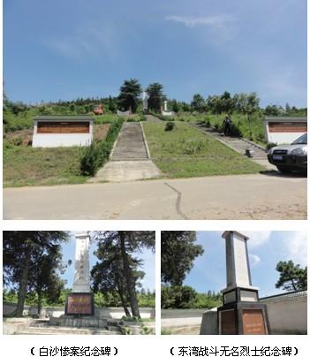 4、白沙烈士墓(白沙惨案纪念碑、东湾战斗无名烈士纪念碑)——位于白沙自然村西山南坡。墓园内矗立有白沙惨案纪念碑、东湾战斗无名烈士纪念碑2座,其中,白沙惨案烈士墓安葬着1943年5月被日军及汪伪自卫团残酷杀害的新四军十六旅供给部副部长涂凤初、联络站站长刘超、通讯员陈永清等6人,以及参加抗日活动的两名国民党军人;东湾战斗纪念碑是为纪念1939年2月新四军一支队2团二营、三营在拔除日军东湾据点的战斗中牺牲的23名无名英雄而树立,纪念他们不怕牺牲、视死如归的大无畏革命精神,以激励后人、缅怀先烈。